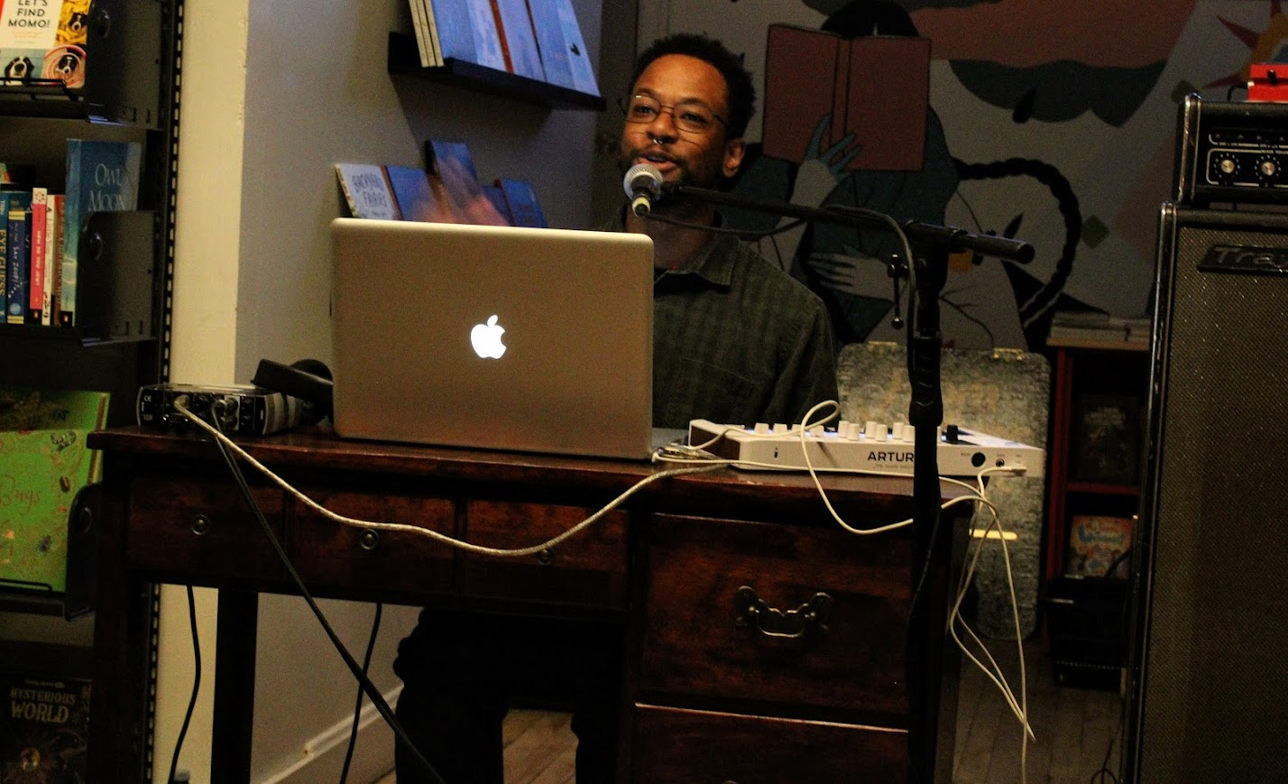 Garrett Gilbart kicked off the night with an artist talk and demonstration of his sound art installation, which was displayed at the front of Take Cover Books from February 10th to March 1st.