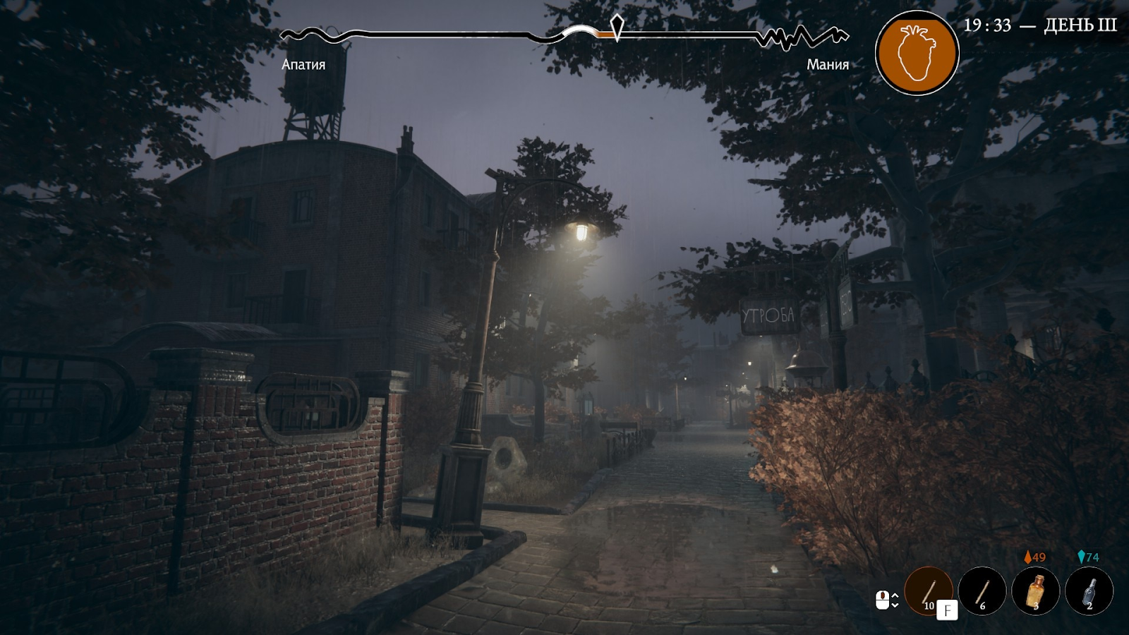 Along with Dankovsky’s introduction to immortality-lite, Pathologic 3 introduces what I like to call the “bipolar system.” One where you must manage our dear Bachelor’s levels of mania and apathy. Players are forced to use the limited resources available and interactable environmental items to teeter your character between extreme states of apathy or mania, and optionally maintain a zen middle ground.