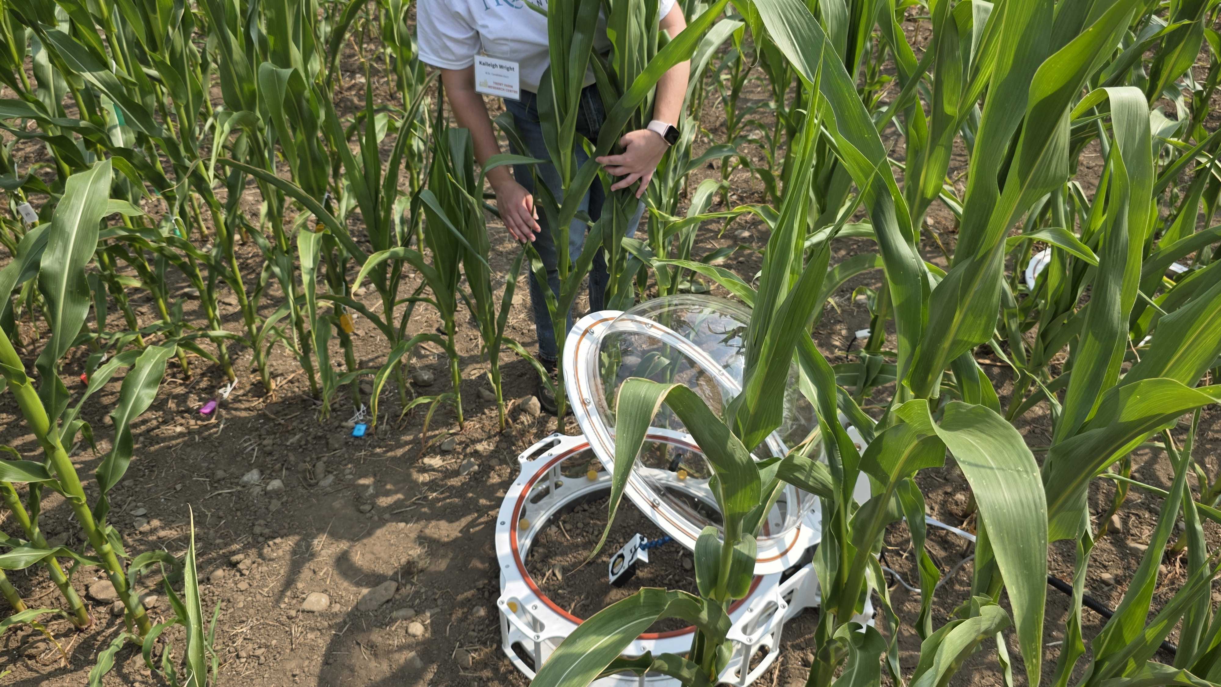“We have these plots here that are fertilized with different generations of the novel fertilizer…this machine [portable gas flux analyzer] here is an automated chamber which can open and close…So when we put the top of our automated chamber down, we can connect it to this portable chamber right here to give real time measurements of the gasses being emitted from the soil,” Wright explained.